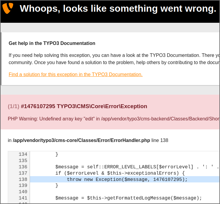 Nach der Änderung eines Datenbankeintrags mit dem Wert routeIdentifier=record_edit ist das Typo3-Backend nicht mehr nutzbar. Da Admin-Benutzer die Möglichkeit haben, diese Lesezeichen global für alle Benutzer zu definieren, führt dies dazu, dass das Backend für alle unzugänglich ist.