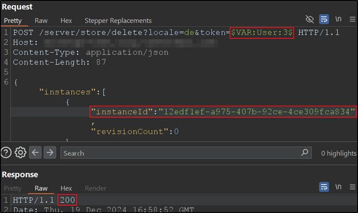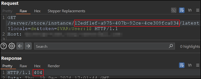 Der folgende Screenshot zeigt einen beispielhaften HTTP-Request an das Backend, der von der Anwendung mit dem Token in der URL gestellt wird: