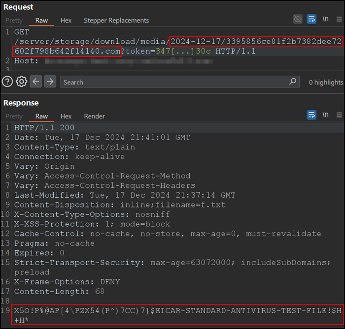 Bemerkung: Dabei ist zu beachten, dass der Session-Token im bösartigen Link der Session-Token des Angreifers ist, der das Opfer zum Herunterladen der vom Angreifer hochgeladenen Datei berechtigt. Der Session-Token, auf den das JavaScript zugreift, ist jedoch tatsächlich der Session-Token des Opfers. Diese Schwachstelle nutzt dabei sowohl die oben beschriebene Schwachstelle des Uploads beliebiger Dateitypen als auch die unten beschriebene Schwachstelle des in der URL übertragenen Session-Tokens aus.