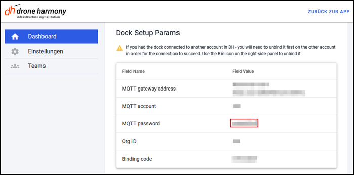 Das Dashboard der Webanwendung zeigt einen Überblick über die Parameter für die Einrichtung des Drohnen-Docks, einschließlich des Passworts für das MQTT-Konto des Benutzers: