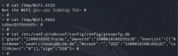 Mit maximalem Zugriff lassen sich nun auch sensible Daten auslesen. So sind die WLAN-Zugangsdaten in den Dateien /tmp/wpa.connect.conf und auch in /tmp/WiFi.SSID und  /tmp/WiFi.PASS zu finden.
