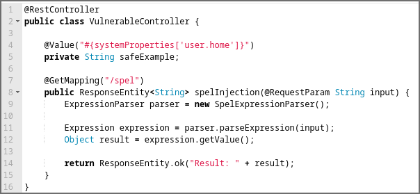 Eine (Spring) Expression Language Injection tritt auf, wenn Code und Daten nicht ordnungsgemäß voneinander getrennt werden, sodass nicht vertrauenswürdige Eingaben einen EL-Interpreter erreichen können.