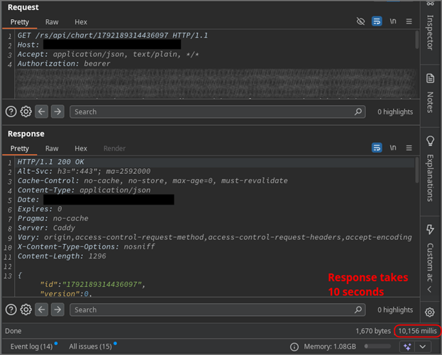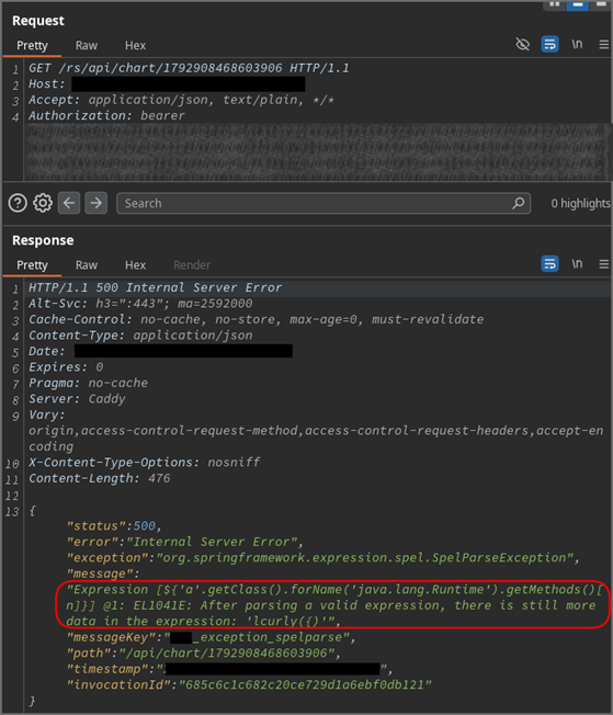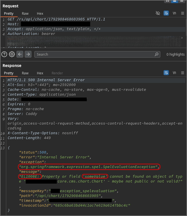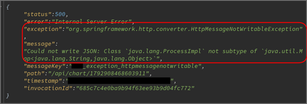 Hinweis: Die Nutzlast löste nicht sofort einen Fehler während der Diagrammerstellung aus, sondern erst, als das Diagramm später in einer zweiten Anfrage abgerufen wurde. Der Screenshot zeigt nur die Antwort auf diese zweite Anfrage. Dies sollte ausreichen, um den Exploit-Pfad zu demonstrieren und gleichzeitig die Kundendaten zu schützen. Aus dem gleichen Grund werden nur teilweise Anfrage- und Antwortdaten angezeigt, wobei sensible Teile unkenntlich gemacht wurden.
