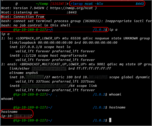 Nachdem der RCE bestätigt war, bestand der nächste Schritt darin, den cURL-Aufruf durch einen Reverse-Shell-Payload zu ersetzen. Nach dem Auslösen durch das Abrufen des manipulierten Diagramms stellte die Reverse Shell erfolgreich eine Verbindung zu unserem Server her, wodurch wir die Kontrolle über den Host erhielten.