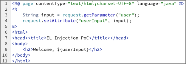 Der folgende (anfällige) Codeausschnitt kann verwendet werden, um Daten aus der URL abzurufen und auf der Webseite anzuzeigen. Der Parameter „user“ wird über ${userInput} direkt an einen EL-Ausdruck übergeben. Wenn ein Angreifer eine EL-Syntax wie ${7*7} oder ${request.getHeader(„host“)} angibt, wird diese vom EL-Prozessor ausgewertet.
