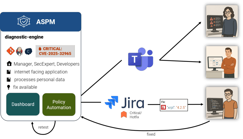 Ein ASPM-System bringt nicht nur mehr technische Sicherheit, sondern auch spürbare Entlastung und Effizienzgewinne für alle beteiligten Rollen im Unternehmen. Sicherheitslücken werden automatisch erkannt, kontextbasiert bewertet und direkt an die relevanten Personen weitergegeben ohne Umwege oder manuelle Eskalationen. Entwickler:innen erhalten konkrete Hinweise zur Behebung direkt in ihrer gewohnten Umgebung, etwa durch Pull-Request-Kommentare oder Ticket-Systeme. Die Lösungsempfehlungen sind auf das jeweilige Projekt zugeschnitten und enthalten z. B. konkrete Versionshinweise für verwundbare Abhängigkeiten. Projektverantwortliche sehen klar, welche Schwachstellen für ihre Anwendungen wirklich kritisch sind inklusive Risikoeinstufung, Fortschrittsverfolgung und Verantwortlichkeiten. Gleichzeitig gewinnen Security-Teams Zeit und Übersicht, da sie nicht mehr jeden Fall einzeln managen müssen: Die Koordination läuft automatisch, die Eskalation ist geregelt, und der Gesamtstatus der Sicherheitslage ist jederzeit einsehbar. So entsteht ein transparenter, durchgängig gesteuerter Sicherheitsprozess, der Reibungsverluste vermeidet, Doppelarbeit reduziert und alle Beteiligten gezielt dort, wo es sinnvoll ist einbindet.