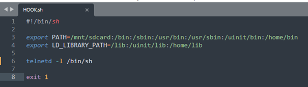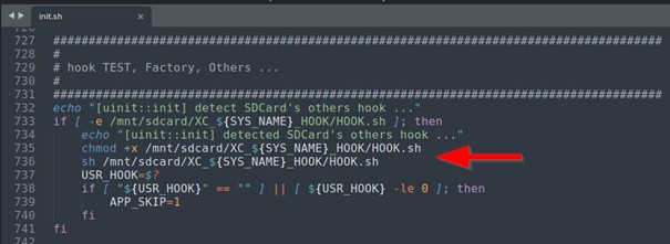 During boot, the script verifies the presence of /mnt/sdcard/XC_${SYS_NAME}/HOOK.sh on the memory card (where SYS_NAME is the model name) and, if the file exists, runs it with root privileges.