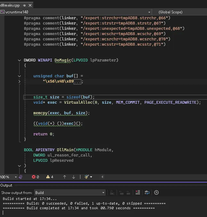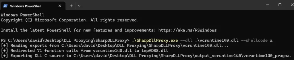 As a way to keep Edge working as intended, we “proxied” the original “vcruntim140.dll” – located in “c:\windows\system32” – and added our malicious code, which connects back to our command & control (C2) server.