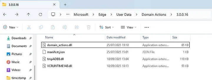 To prevent this use-case in particular, you can simply monitor the “%LocalAppData%\Microsoft\Edge\User Data\Domain Actions\3.0.0.16\” folder for any file creation with the name “vcruntime140.dll”.