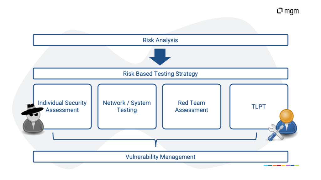 - Risikoeinschätzung: Wir unterstützen Sie bei der Entwicklung eines risikobasierten Testprogramms, führen eine Bedrohungsanalyse Ihrer IT-Landschaft durch und empfehlen Ihnen eine Lösung, die genau auf Ihre Anforderungen abgestimmt ist.